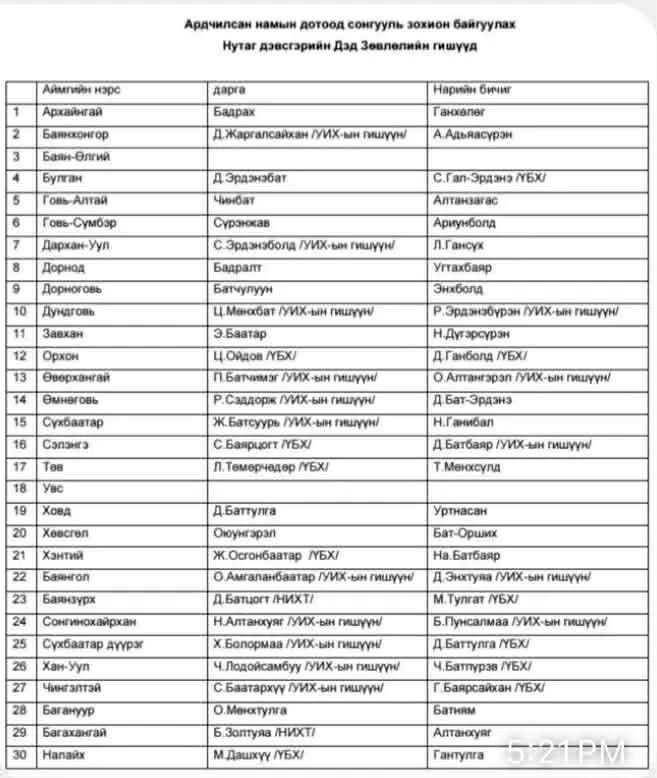 Аймаг, дүүргийн Ардчилсан намын дотоод сонгуулийг зохион байгуулах дэд зөвлөлийн гишүүдийг доорх хүснэгтээс харна уу: