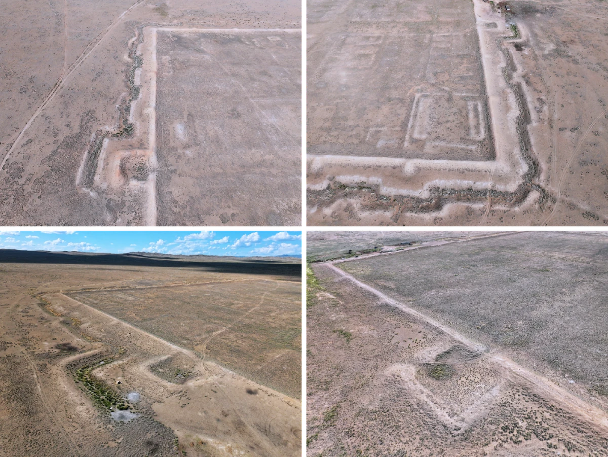 图3 乌兰和日木古城第一城西城门、瓮城、护城壕(左上);西南角建筑基址和护城壕(右上);南门、瓮城、西南角、护城壕(左下);东门和瓮城(右下)